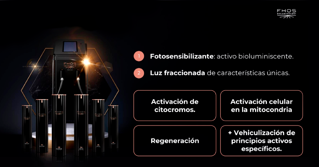 Destinado a proporcionar los mejores resultados en tan solo 15 minutos. Completamente único y revolucionario, el sistema de trabajo FHOS, consigue un control total de la luz generando una capacidad lumínica de alta intensidad en el interior de la piel, llegando a aportar la energía lumínica más alta sin el añadido del calor.
